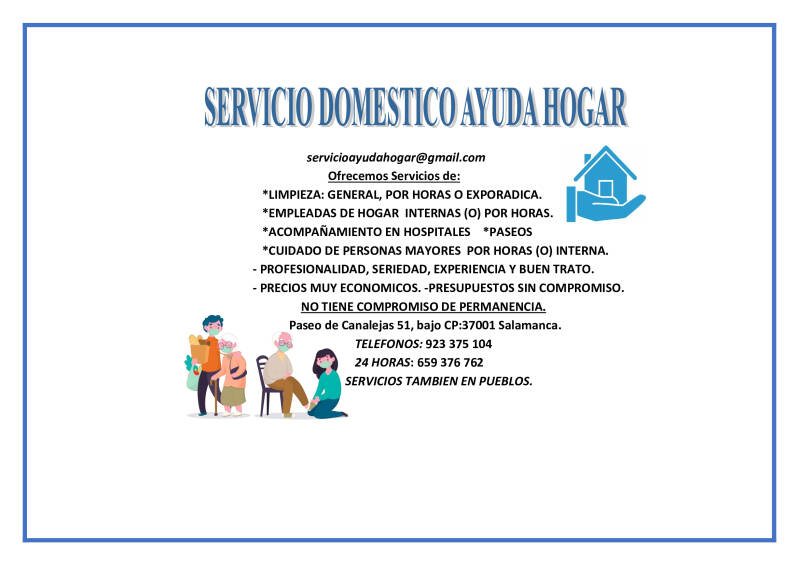 En Empresa de Servicio Ayuda-Hogar nos especializamos en brindar atención de calidad y cariño a las personas mayores en Salamanca. Personal experimentado y amable que garantiza un servicio excepcional a precios muy económicos, sin compromiso de permanencia. Ofrecemos servicio de limpieza de portales, oficinas y pisos nuestro equipo capacitado permite garantizar un servicio de limpieza a tiempo y con un acabado perfecto. Estando siempre pendientes del trabajo previamente realizado.